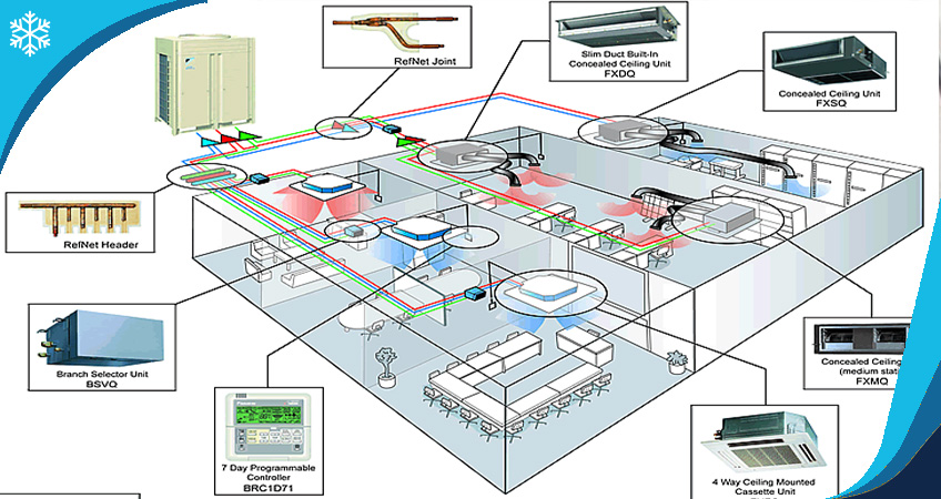 VRF (Variable Refrigerant Flow) sistemleri, büyük binalar ve kompleks yapılar için enerji verimliliği ve esneklik sağlayan gelişmiş bir iklimlendirme sistemidir. Bu sistemlerde, bir dış üniteye bağlı birden fazla iç ünite kullanılarak bina içerisindeki farklı alanların iklimlendirilmesi sağlanır. VRF sistemleri, her bir iç ünitenin bağımsız olarak kontrol edilebilmesine olanak tanır, bu da kullanıcılara büyük bir konfor ve tasarruf avantajı sunar.
